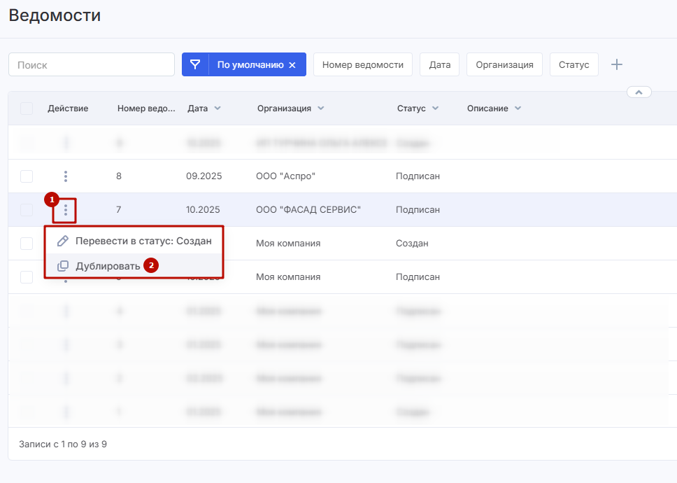 Для этого в списке найдите ведомость, которую хотите скопировать, откройте контекстное меню (1) и выберите пункт «Дублировать» (2).