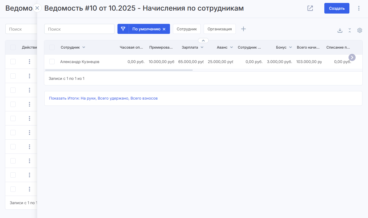 Будьте внимательны: перевод ведомости из статуса «Создан» в статус «Подписан» автоматически создаст расходные операции в разделе «Деньги» и отчете «Прибыли и убытки».