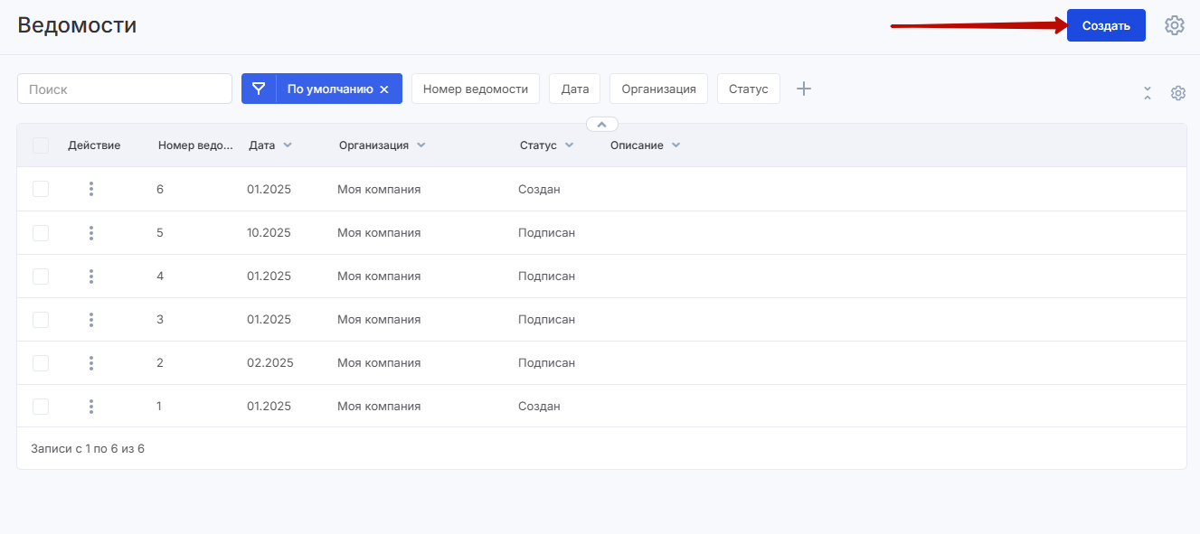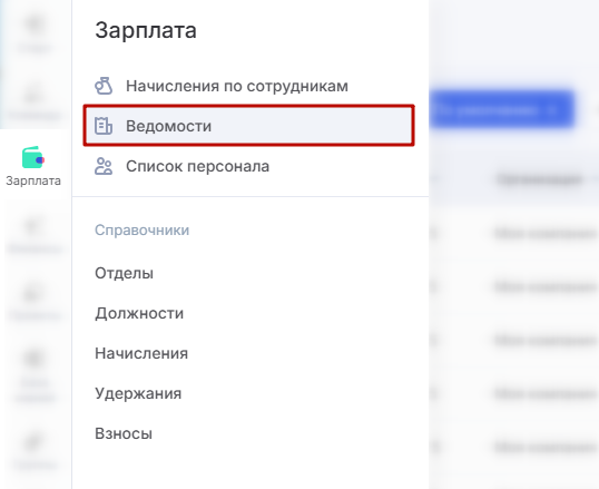 Из меню модуля «Зарплата» перейдите в раздел «Ведомости».
