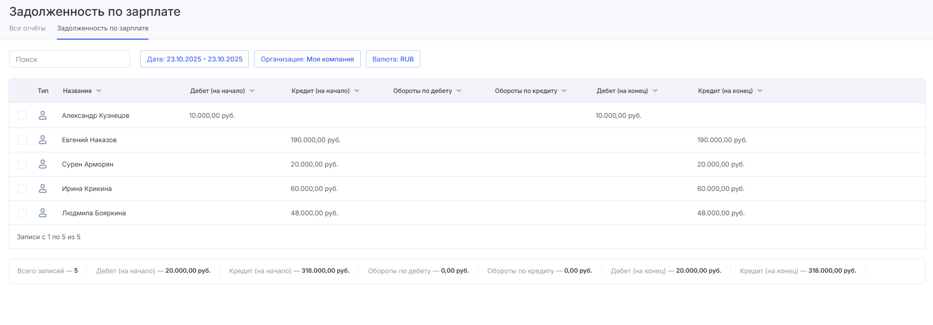 Вместе с модулем «Зарплата» в системе также будет доступен отчет о задолженности по зарплате. В нем вы сможете быстро определить. есть ли у вас долг перед сотрудниками.