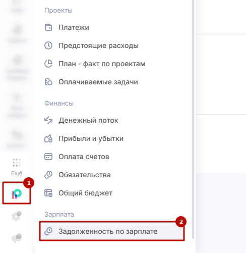 Чтобы перейти к этому отчету, откройте раздел «Отчеты» (1) в левом меню и выберите «Задолженность по зарплате» (2).