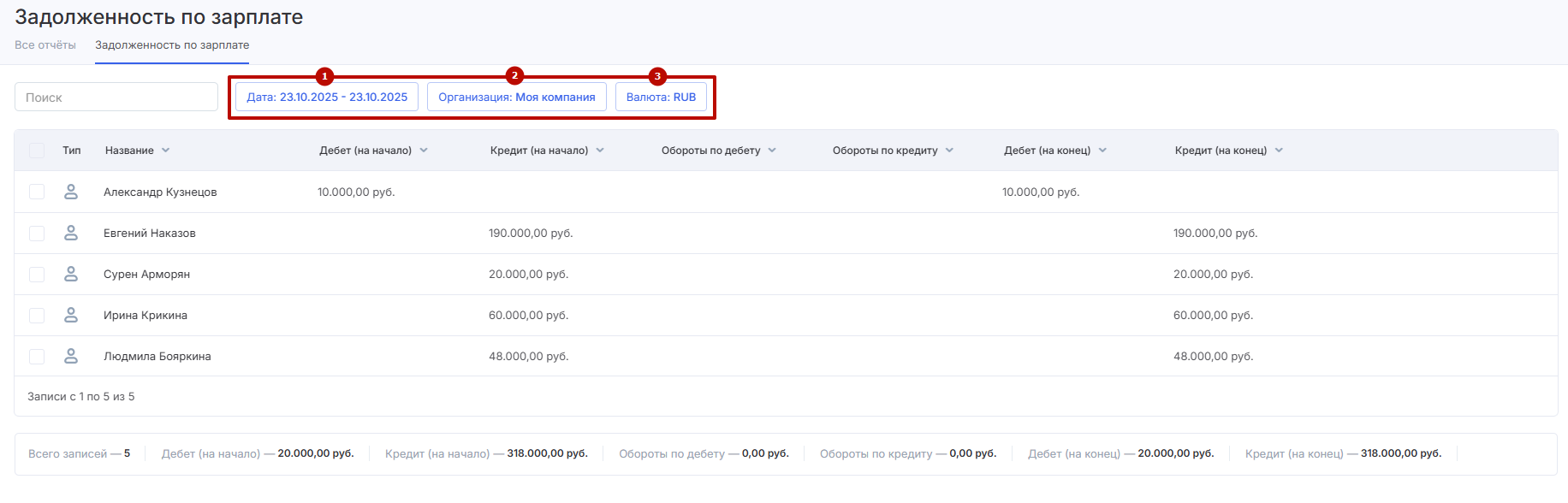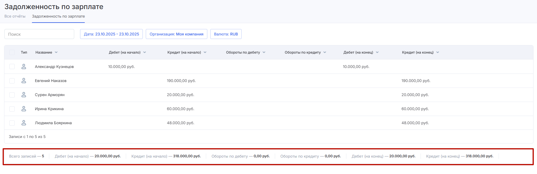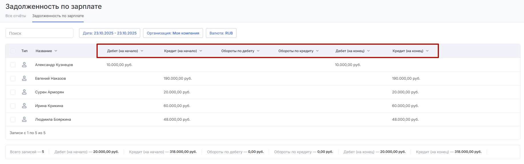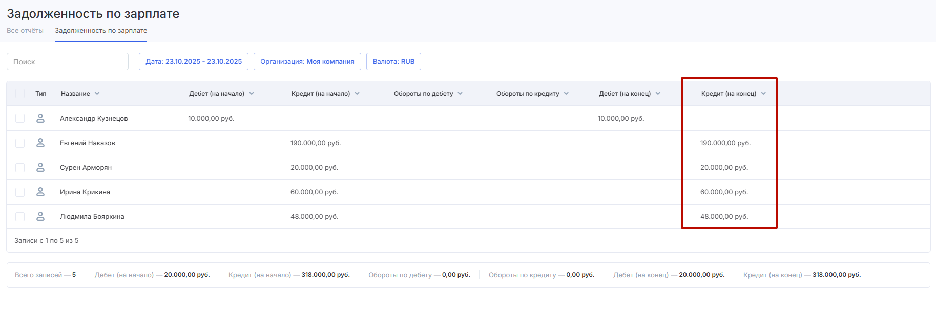 Фактическую задолженность компании — сколько она должна выплатить своим сотрудникам на конец периода — отображает колонка «Кредит (на конец)».