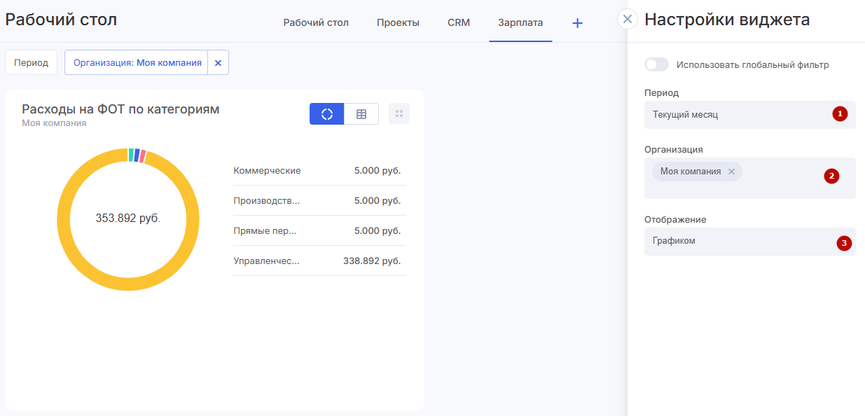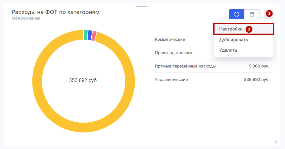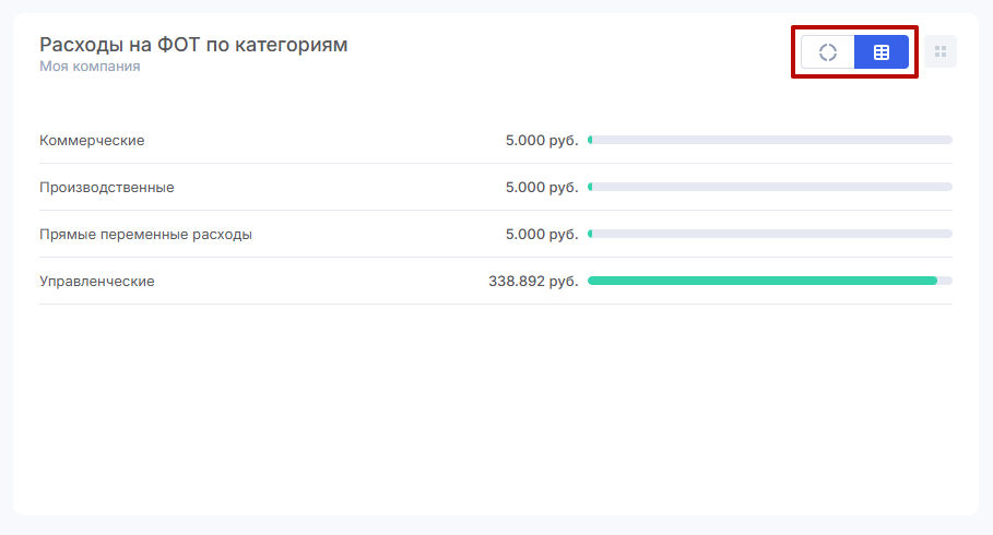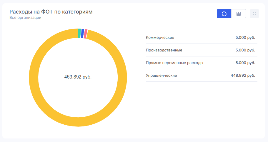 Этот виджет разбивает данные по расходам на персонал — в соответствии с отчетом «Прибыли и Убытки» — на следующие категории: