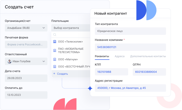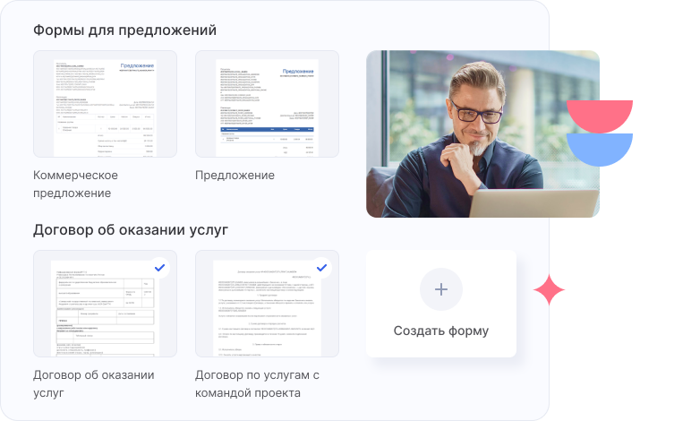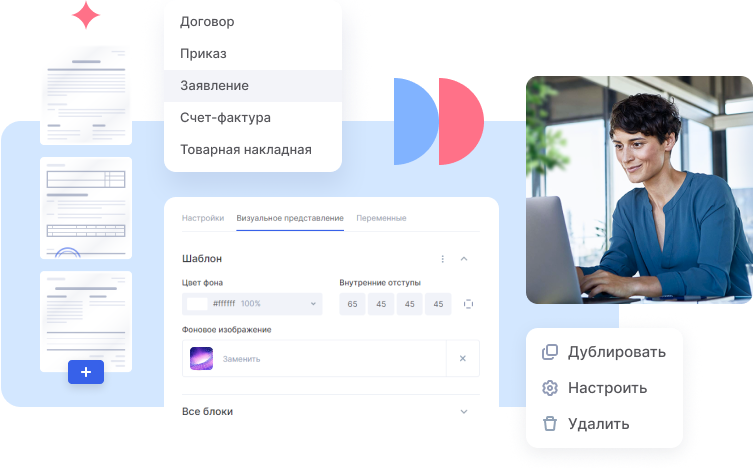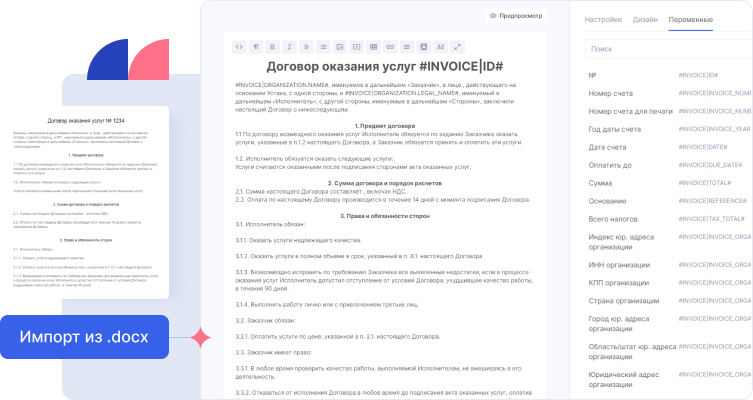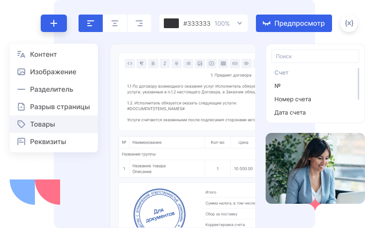 Подготовьте формы счетов, договоров и распоряжений, чтобы в нужный момент быстро создать документ. Вы сами задаете структуру: добавляйте любые поля, переменные, формулы, изображения и таблицы.