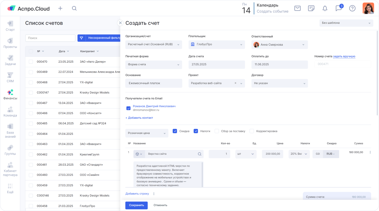 В сервисе также можно организовать работу: ставить задачи, планировать проекты, следить, кто что делает и к какому сроку. А еще следить за деньгами бизнеса и быть уверенным, что все идет по плану. Еще одно преимущество Аспро.Cloud в том, что это единое пространство для всех рабочих процессов.