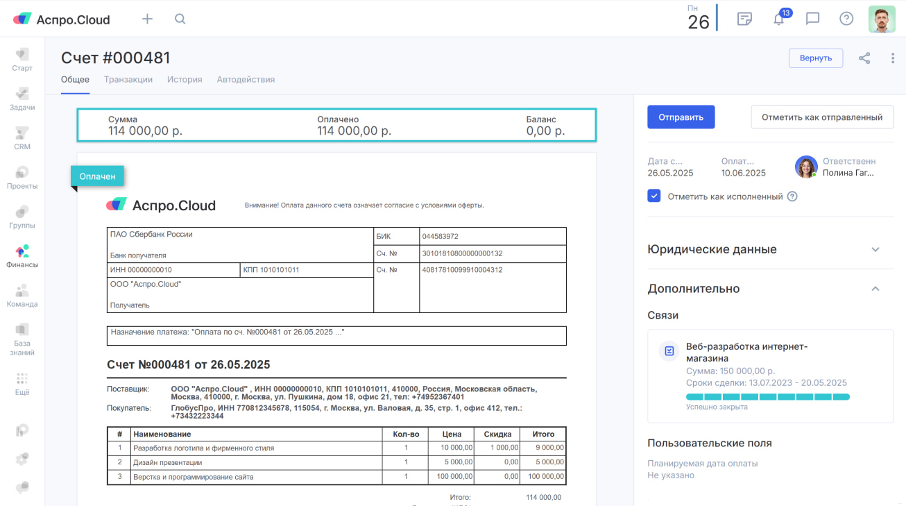 Как отправить счет в Аспро.Cloud