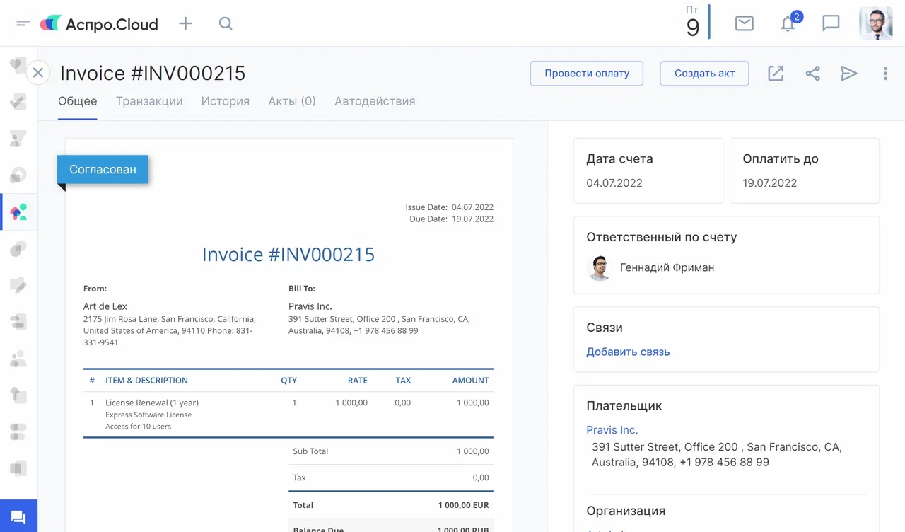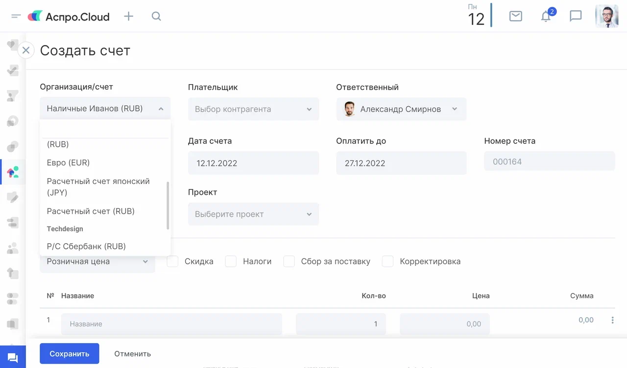 Печатная форма — настраиваемая под потребности бизнеса форма счета или акта. Например, счет на услуги, счет на товары, счета для оптовых покупателей. Аспро.Cloud позволяет создать шаблоны документов и формировать их для клиентов в 2 клика. Их можно настроить для разных случаев в зависимости от типа клиентов. Например, подготовить шаблон печатной формы для иностранных заказчиков на нескольких языках. Это позволяет работать с зарубежными партнерами более эффективно.