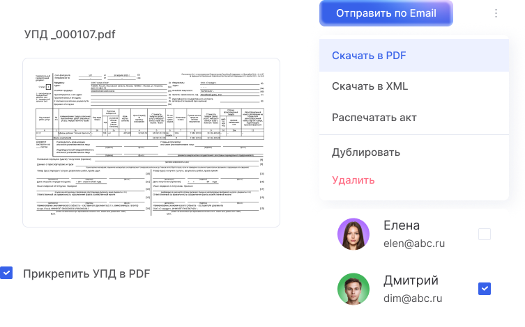 После заполнения универсального передаточного документа его можно сразу отправить клиенту по email или сохранить в PDF. Также можно распечатать или переслать в мессенджере. Все делается прямо в сервисе.