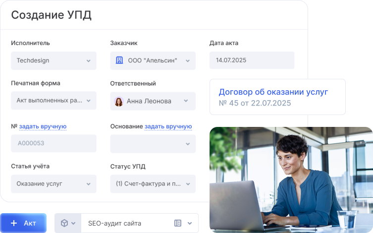 Откройте форму УПД, выберите контрагента и добавьте нужные позиции. Сервис сам подставит реквизиты, расчет сумм и НДС — вам останется только проверить и сохранить. Никаких шаблонов в Excel и ручного ввода строк.