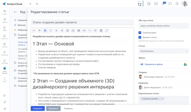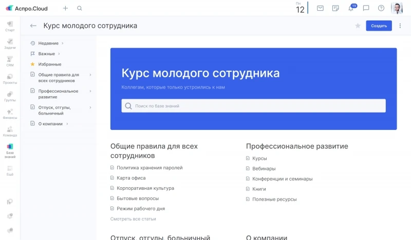 Также в Аспро.Cloud есть модуль «База знаний». В ней можно создать отдельный раздел для обучения новичков и добавить полезные материалы, которые помогут сотрудникам в работе.