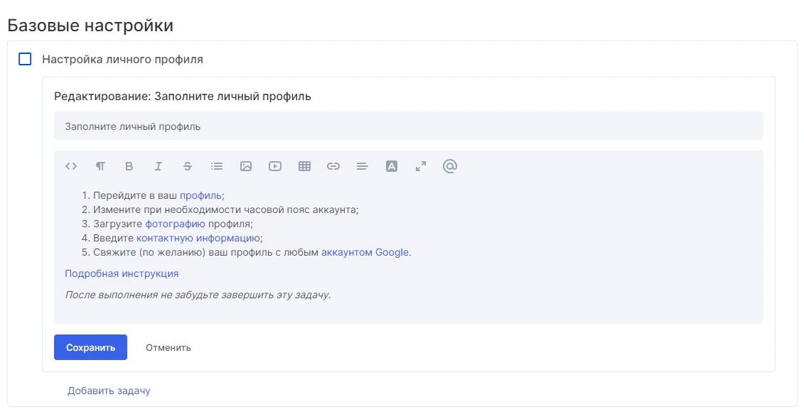 В сервисе есть специальный модуль «Онбординг», где можно составить пошаговый адаптационный план для нового сотрудника в виде чек-листов. Вы можете подробно расписать задачи для каждого этапа и прикрепить ссылки на обучающие материалы.