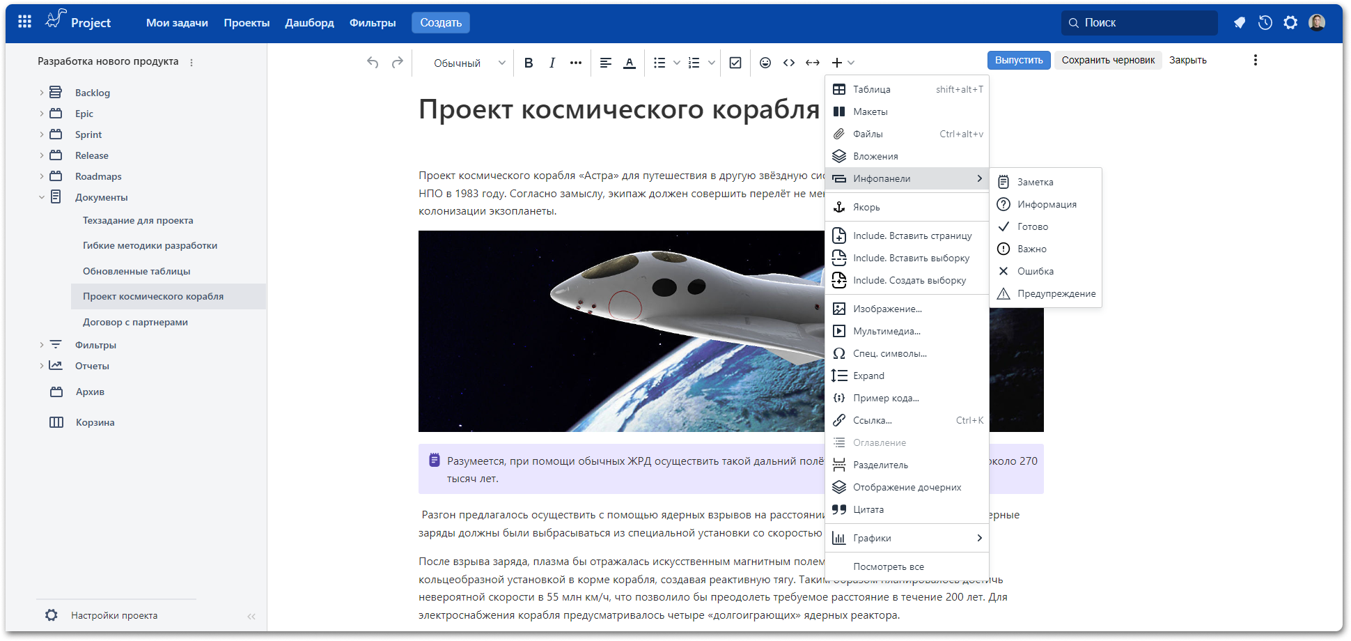 Встроенный редактор. Позволяет форматировать тексты, добавлять на страницы изображения, таблицы, списки, чек-листы и другие элементы.