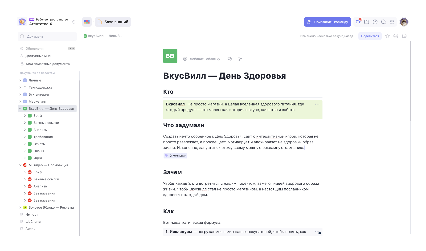 Внутренняя или корпоративная база знаний — место хранения информации для сотрудников. Здесь можно размещать должностные инструкции, регламенты и другие полезные материалы, которые помогут в работе. Также хранилище будет полезно для новичков, которым нужно ознакомиться с корпоративной культурой и базовыми правилами выполнения задач.