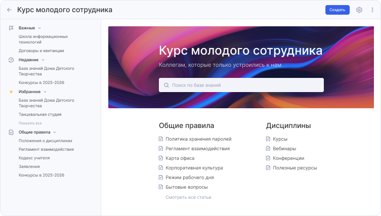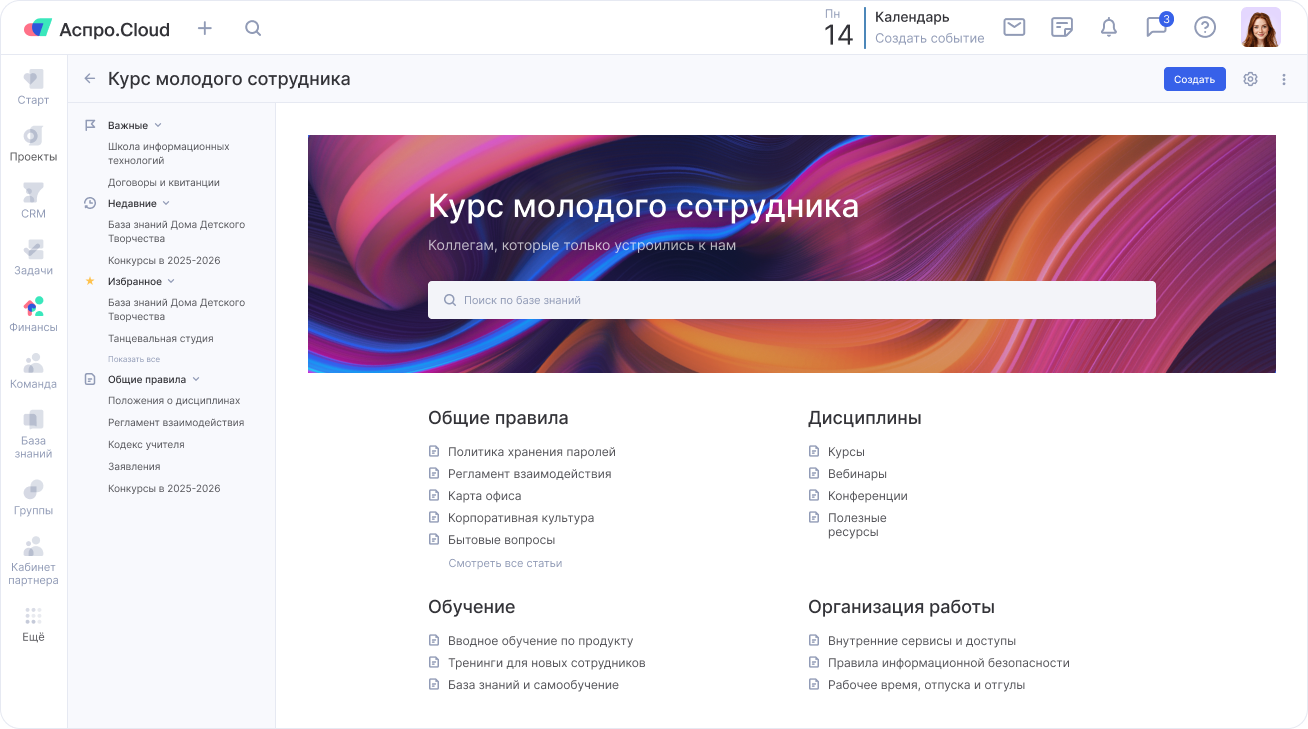 Вы можете создать любое количество разделов для разных целей и групп специалистов. Аспро.Cloud позволяет совместно наполнять базы знаний: делиться опытом и полезной информацией.