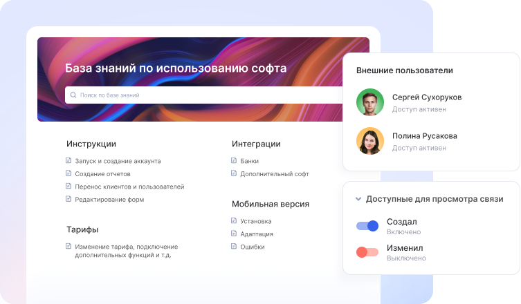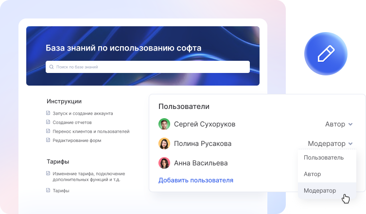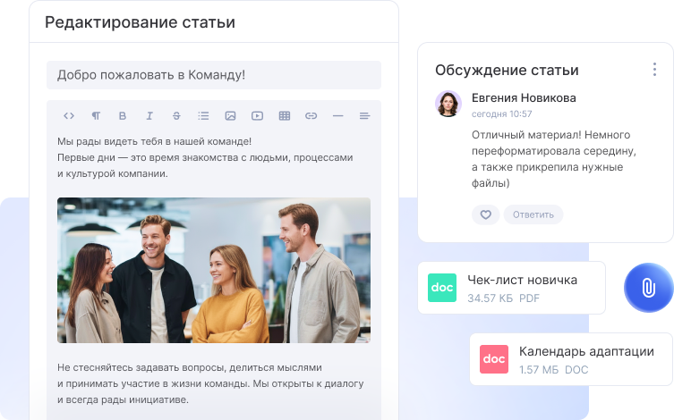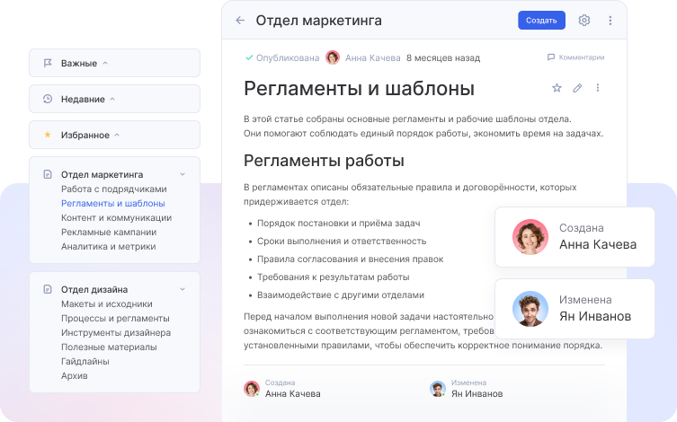 Работа над статьями в базе знаний будет доступна сразу нескольким сотрудникам. Они смогут дополнять и редактировать материалы друг друга. А если нужно уточнить какие-то детали, всегда смогут оставить комментарии к статье.