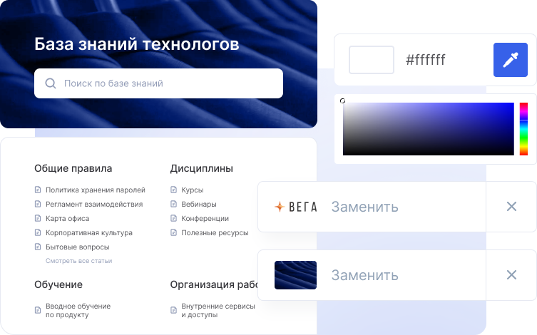 В настройках корпоративной базы знаний возможно настроить под себя вид главной страницы: загрузить фоновую картинку, ваш логотип, поменять цвет шрифта, добавить иконки социальных сетей с ссылками.