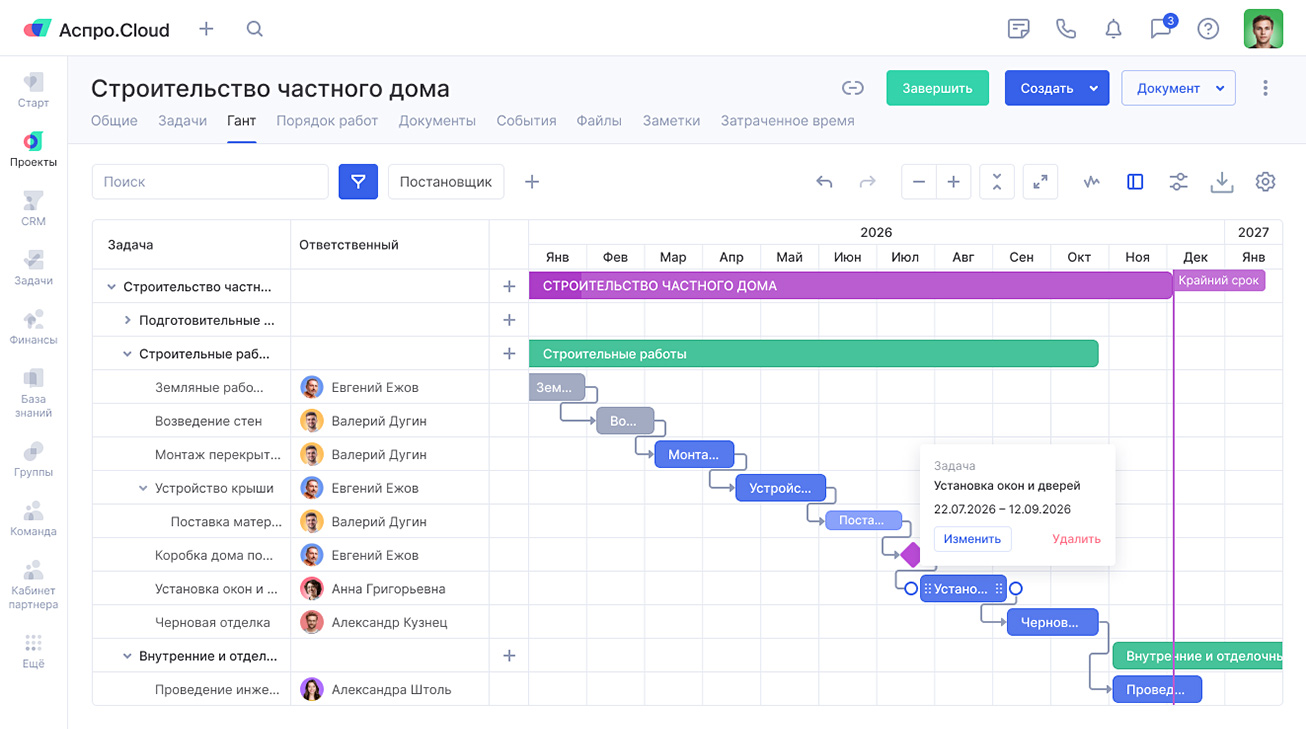 Это способ планировать работу через веб-интерфейс без установки программ. В Аспро.Cloud можно работать с диаграммой Ганта, создавая, редактируя и отслеживая таски в реальном времени из любой точки мира.