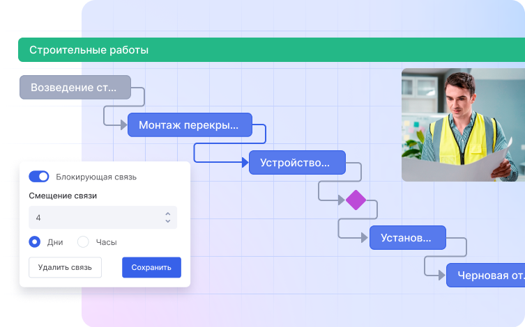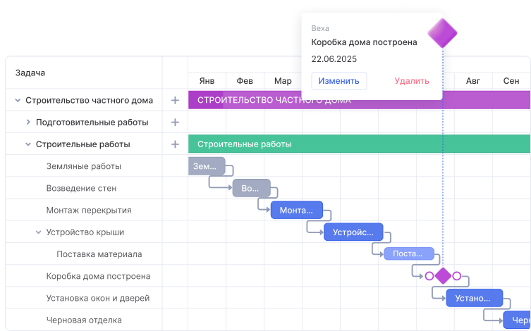 Достаточно зарегистрироваться и начать работу. Вы сможете легко добавлять задания, устанавливать сроки, связывать таски между собой и видеть всю картину работ на таймлайне.