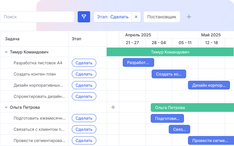 Если вам нужна диаграмма Ганта — сервис, его выбор — это крайне важный шаг. Обратите внимание на простоту использования, поддержку автоматизации сроков и наличие возможностей для командной работы. В Аспро.Cloud все это реализовано, чтобы упростить планирование и контроль поручений, а также работу с диаграммой Ганта.