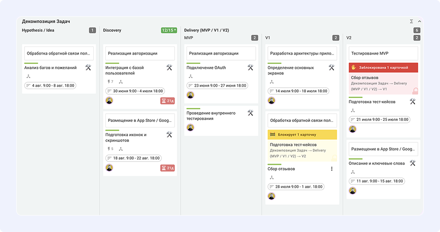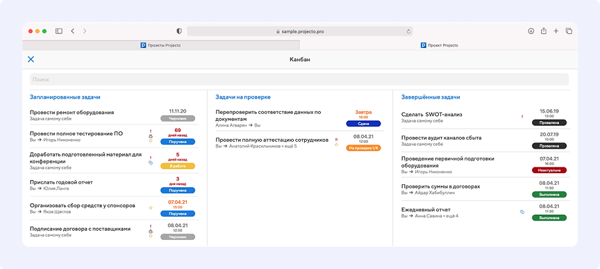 - Канбан-доски. При создании проекта все задачи можно поместить на доску: в ходе их решения карточки будут перемещаться из одной колонки в другую. У каждой карточки отображается статус, исполнители, дедлайн и приоритет. На доске наглядно видно, на каком этапе выполнения находится проект.