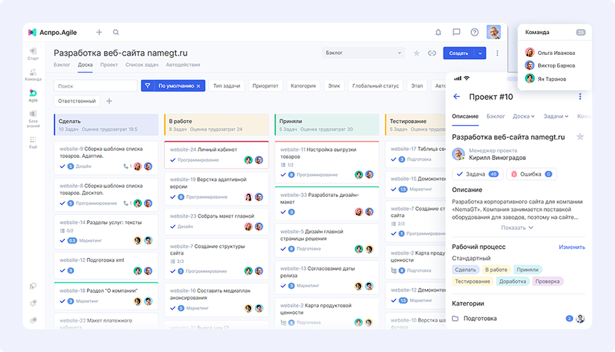 - Соответствует вашей методологии управления проектами. Если работаете по Scrum, смотрите на наличие спринтов, ретроспектив, возможности общаться в сервисе с командой и следить за прогрессом по agile-проекту. Если вы работаете по Kanban, ищите удобную доску с аналитикой по сгоранию задач и WIP-лимитами.