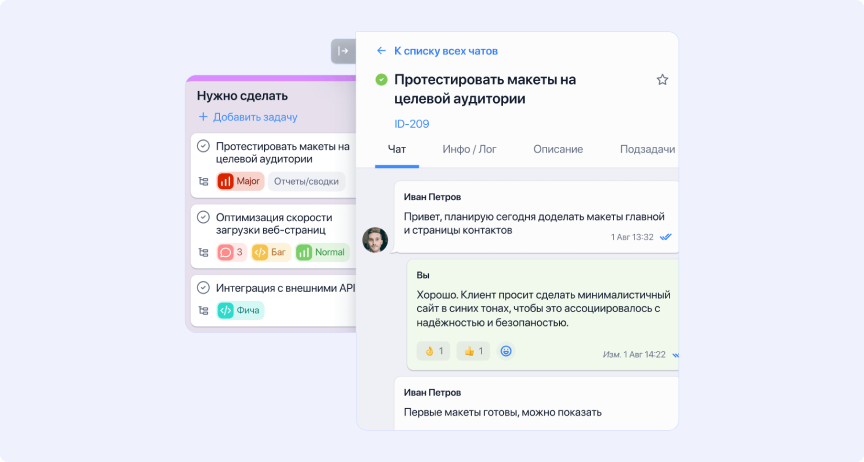 - Совместная работа. Команда может обсуждать проекты в сервисе, а не в сторонних мессенджерах. Чтобы написать что-то по задаче, можно оставить комментарий прямо в карточке и упомянуть коллегу через @ — он получит уведомление. А если нужно обсудить рабочие планы с коллективом, например, провести ежедневный онлайн-стендап, можно создать общий чат во встроенном мессенджере.