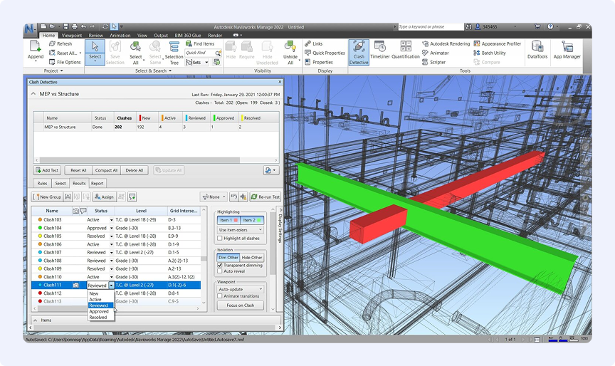 Navisworks. Представьте многоэтажный торговый центр, где десятки километров кабелей и труб. Даже опытные инженеры могут упустить пересечения. Система BIM собирает модели из разных программ и находит все противоречия между ними. И это еще до начала стройки. А еще в программе можно связать модель с календарным планом и бюджетом. Это поможет заранее увидеть, как пойдет строительство.