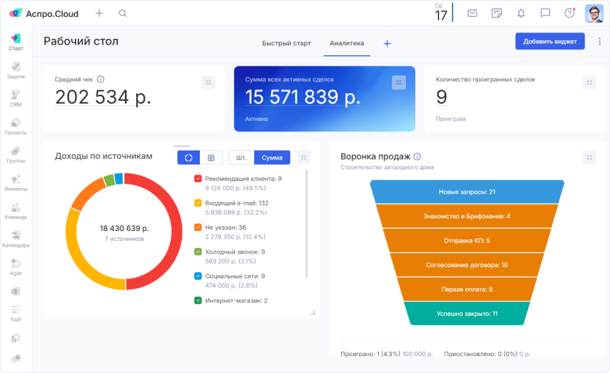 Чтобы следить за сделками, анализировать объем продаж и другие показатели, добавьте виджеты: