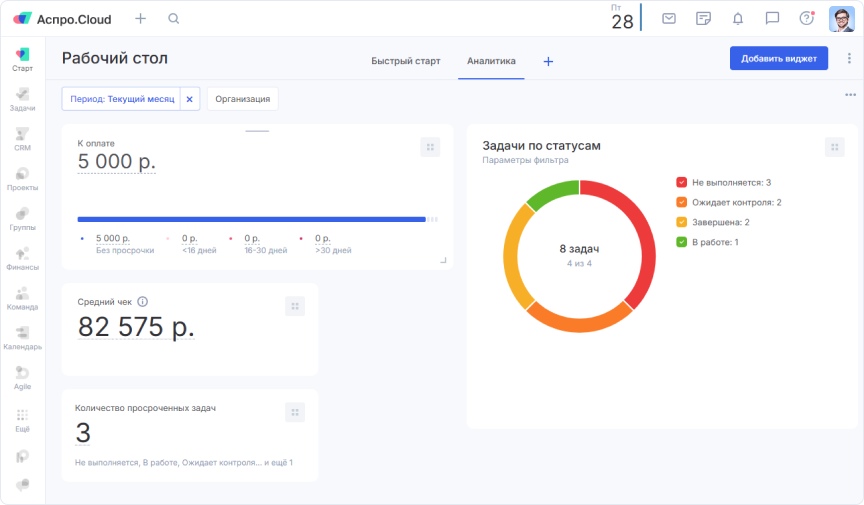 В Аспро.Cloud можно добавить любые виджеты на рабочий стол. Преимущества информационных панелей в системе: