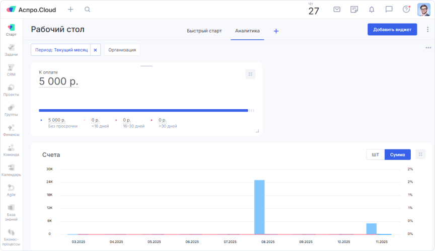 Счета. Здесь отобразятся все счета и их статус: сколько выставлено, оплачено, просрочено. Так вы будете держать дебиторскую задолженность под контролем и планировать поступления.