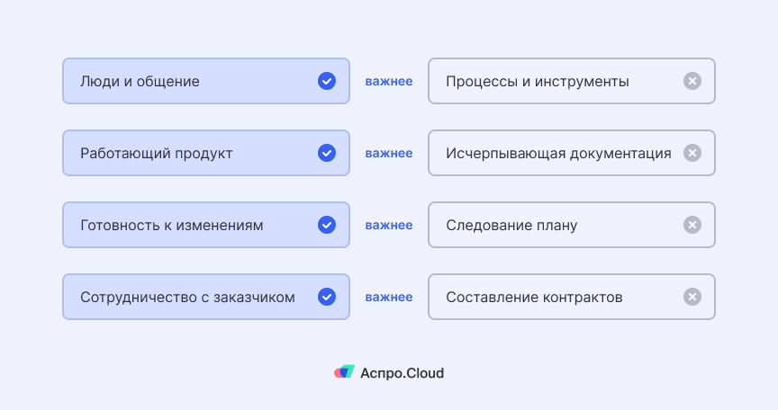 В философии Agile сотрудники придерживаются четырех ценностей: