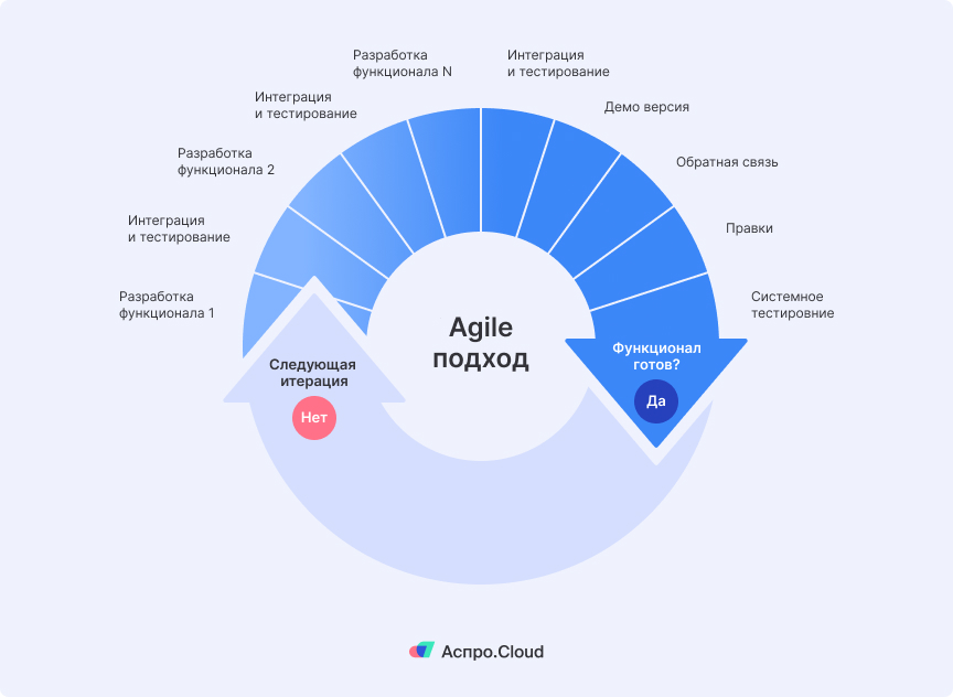 Ведь планирование, каким бы детальным и исчерпывающим оно не было, не может предусмотреть форс-мажоры, изменения требований заказчика и влияние рынка. Поэтому при управлении проектами Agile команда больше ориентируется на краткосрочные планы и текущий результат. А если цель не была достигнута, сотрудники запускают следующую итерацию и повторно проходят все этапы разработки от планирования до тестирования.