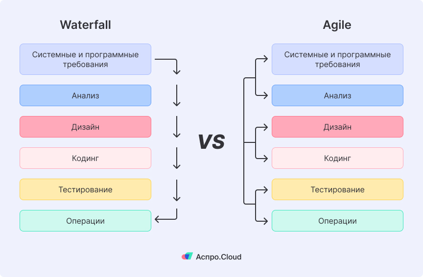 Agile подход — это полная противоположность Waterfall. Мы собрали основные отличия этих методологий в таблице: