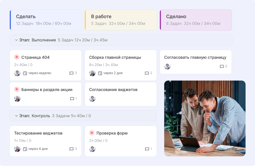 - быстро находить задачи по тегам, исполнителю или срокам;