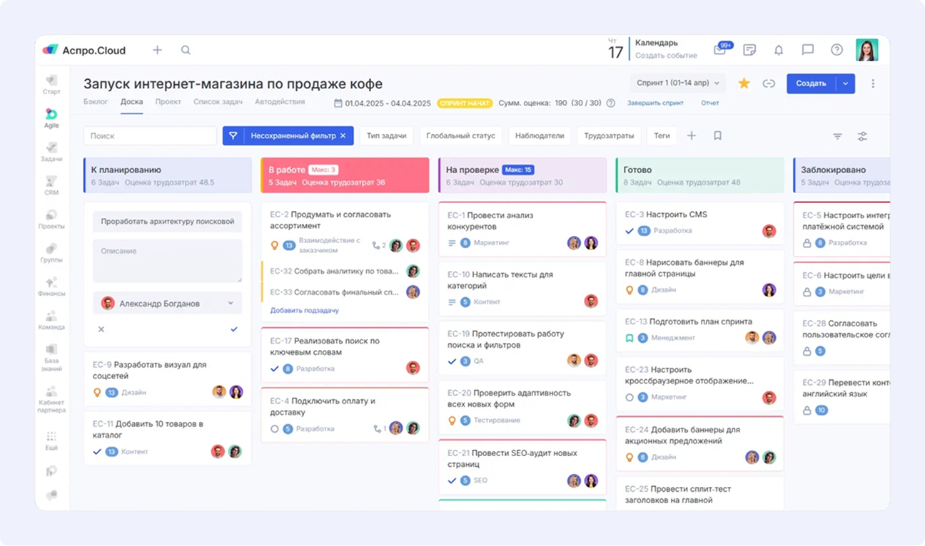 В системе для управления бизнесом Аспро.Cloud можно внедрить этот вид Agile-методологии и использовать Канбан-доску. С помощью нее вы можете: