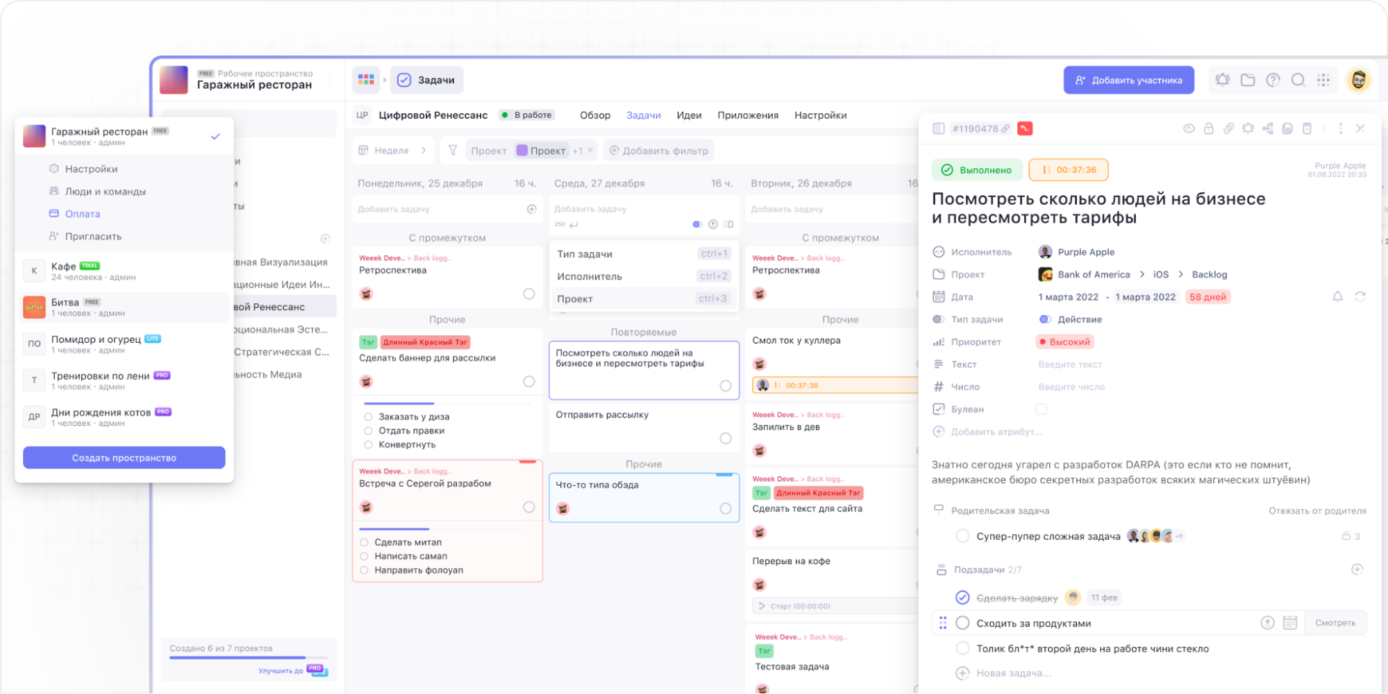 Задачи и подзадачи. Каждое задание можно разбивать на подзадачи, задавать приоритет, прикреплять чеклист, файлы, выбрать цвет и назначать ответственного.