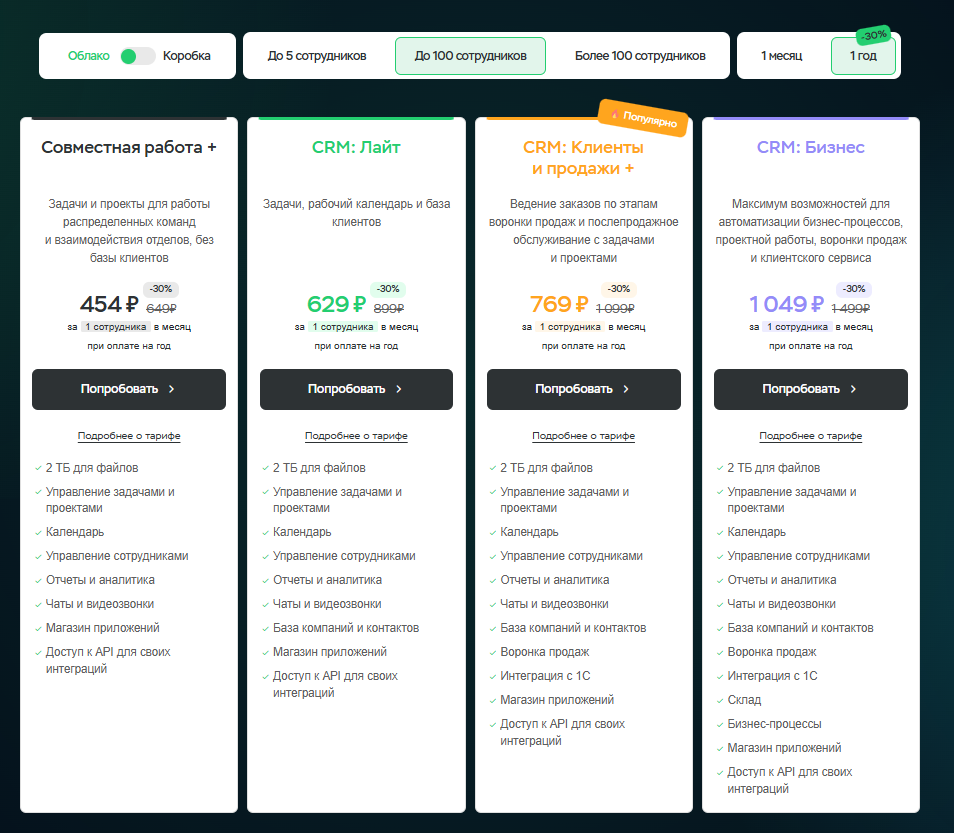 Чтобы получить больше полезного функционала для совместной работы, нужно перейти на платный пакет. Тарифные планы отличаются количеством пользователей и набором возможностей.