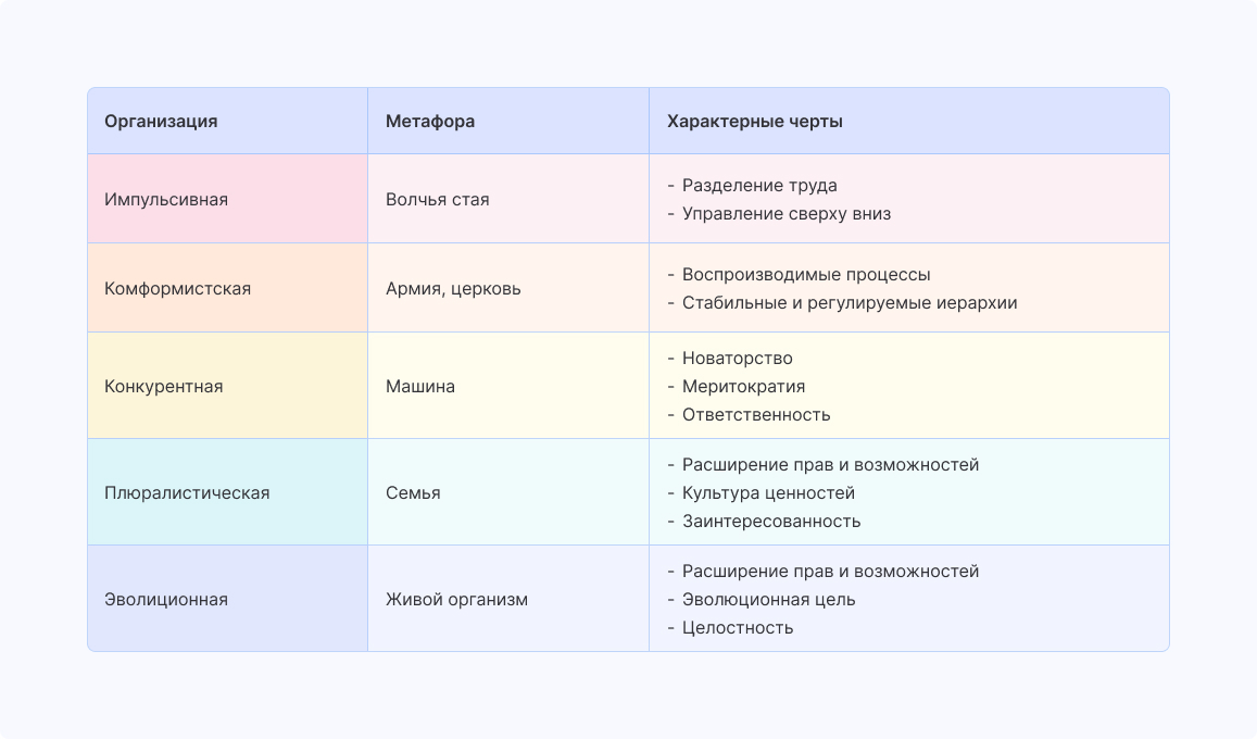 Теория Фредерика Лалу о типах цветных организаций тоже завязана на тождестве бизнеса и человека. Но в другом ключе: он находит сходства не в биологическом росте, а в эволюции сознания. Как люди развивались и становились более осознанными, так и компании совершенствуются, когда переходят определенные эволюционные ступени.