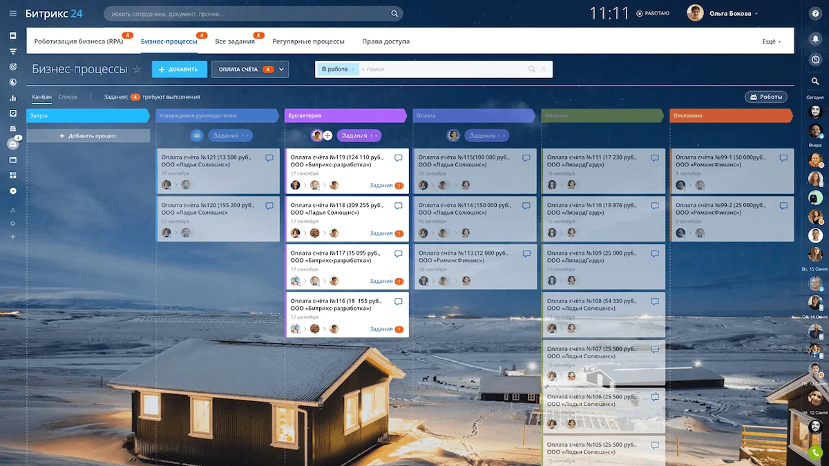 Бизнес-процессы. В программе можно создать цепочку автодействий, например, для согласования оплаты или найма сотрудников. Система автоматически меняет ответственных и назначает задания по заданному сценарию. Операции идут по плану, без необходимости вручную контролировать этапы. Увидеть ход работы можно на канбан-доске. А узнать подробнее про процесс можно в карточке. Так, информация о работе будет под рукой.