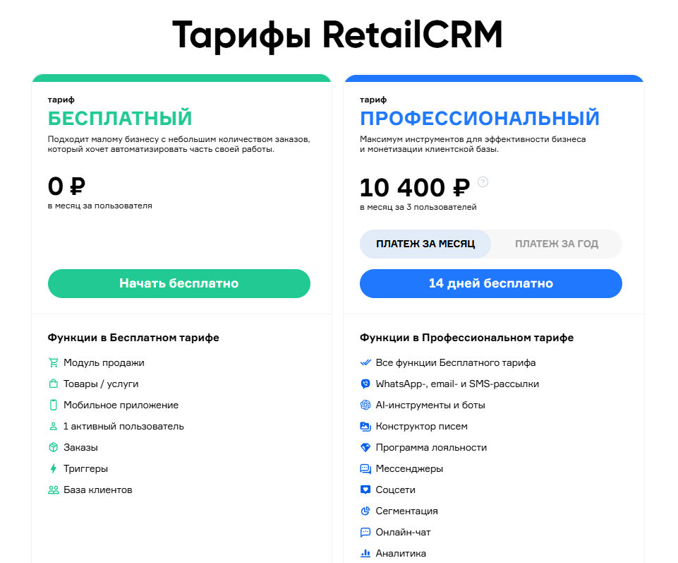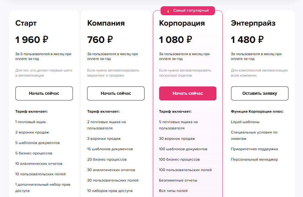 Бесплатный тариф: есть. Если платформа автоматизации бизнеса понравится, выберите один из 4 платных тарифов.