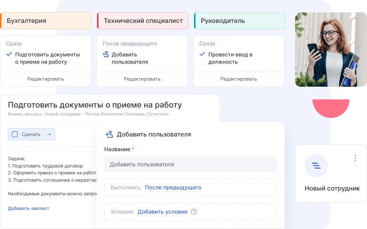Также есть модуль «Бизнес-процессы». Он объединяет операции компании в одну цепочку автодействий. Например, с помощью инструмента быстрее нанимать новых сотрудников. Для этого процесс запустит автодействия и задачи в разных модулях. Достаточно задать условия для действий. Это экономит время и помогает идти по плану без постоянного контроля.