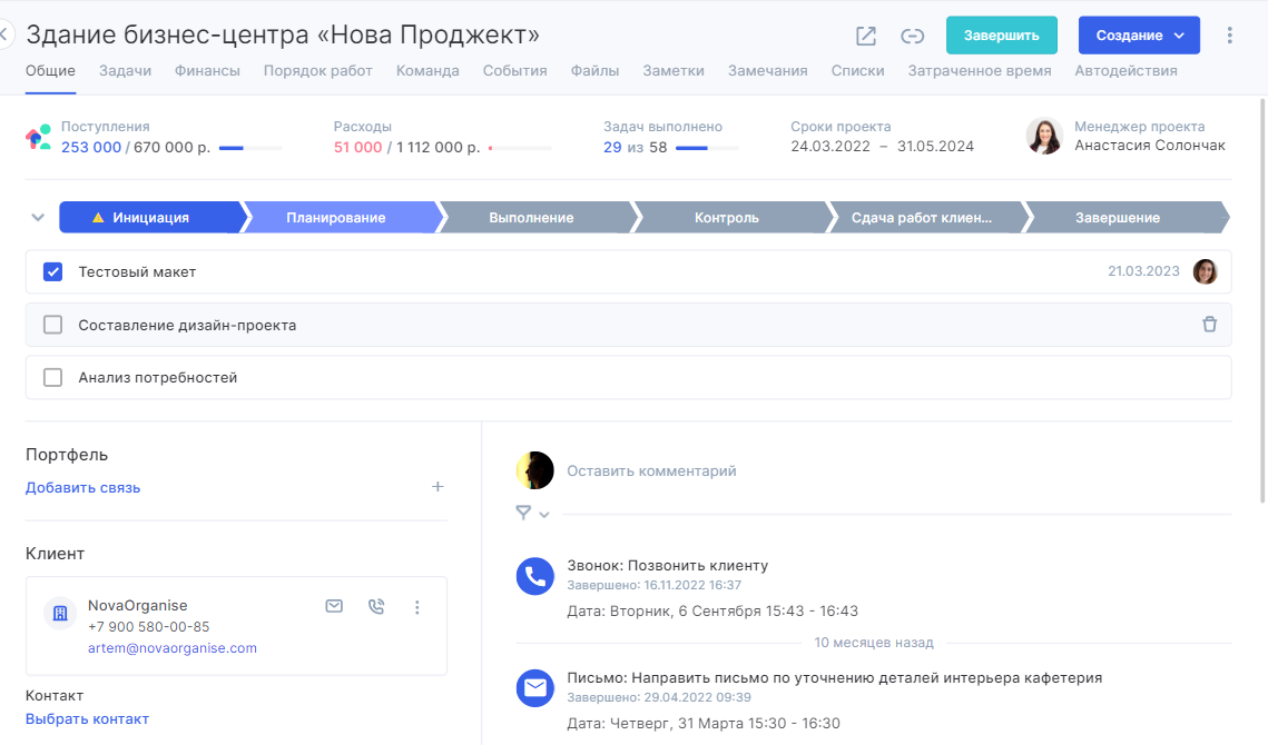 Связка с финансами. В управлении проектом важно не только следить за сроками и задачами. Аспро.Cloud позволяет контролировать поступления и списания, рентабельность всего проекта и избегать кассового разрыва.