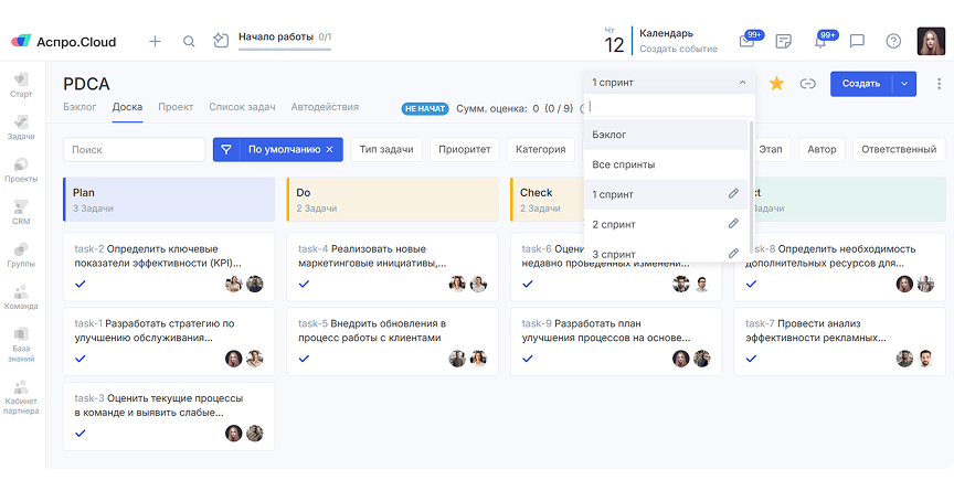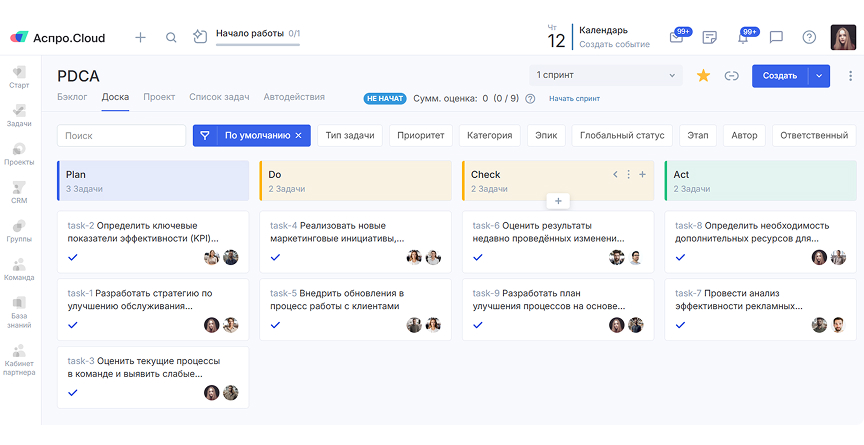 Сервис Аспро.Cloud для управления проектами помогает организовать и визуализировать работу по методу Деминга. На канбан-доске можно отобразить все этапы цикла. Между колонками будут перемещаться карточки с задачами. В каждой из них указан исполнитель и сроки выполнения. Все сотрудники видят объем и порядок предстоящей работы, а руководитель наблюдает за всеми бизнес-процессами компании.