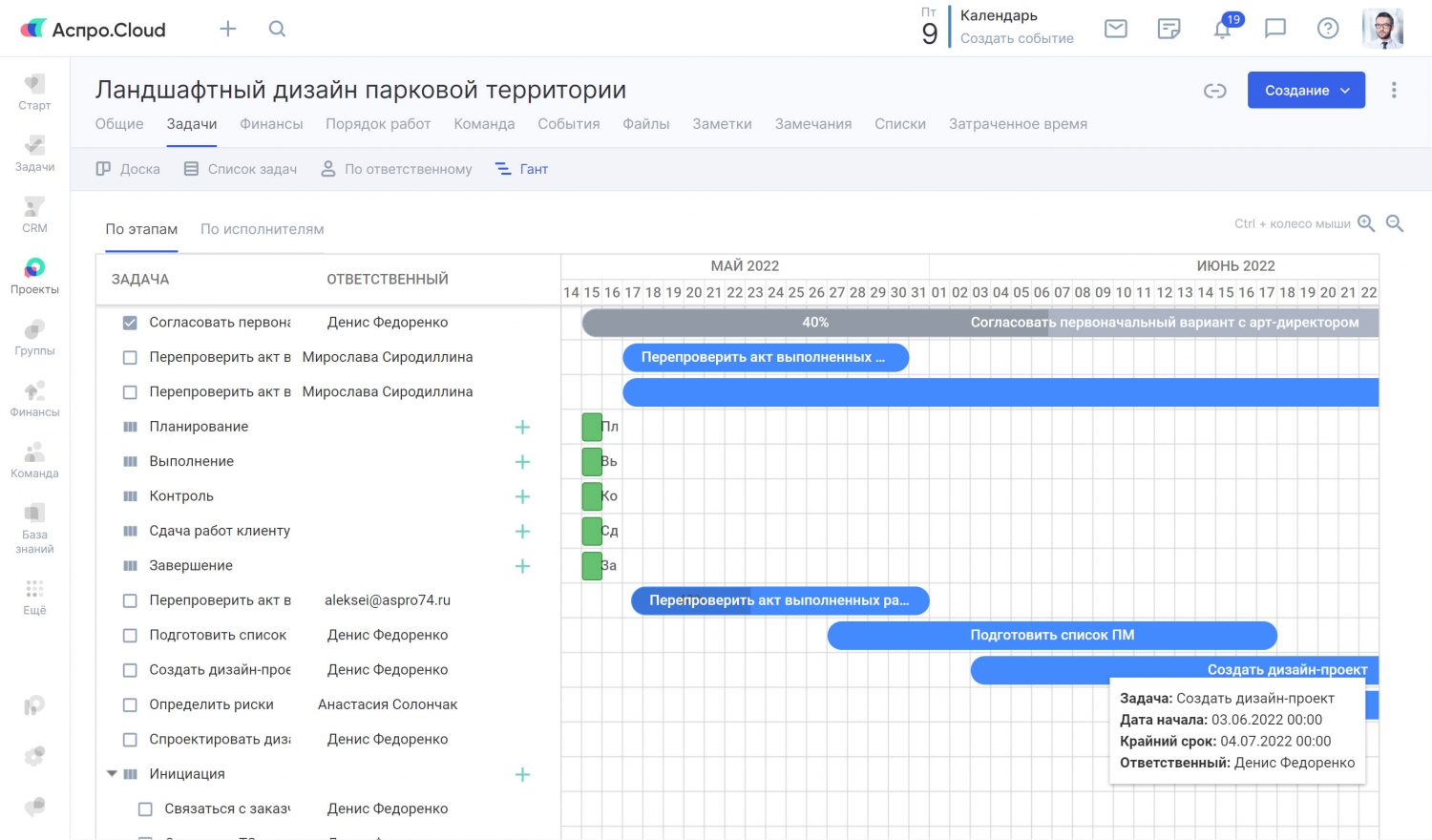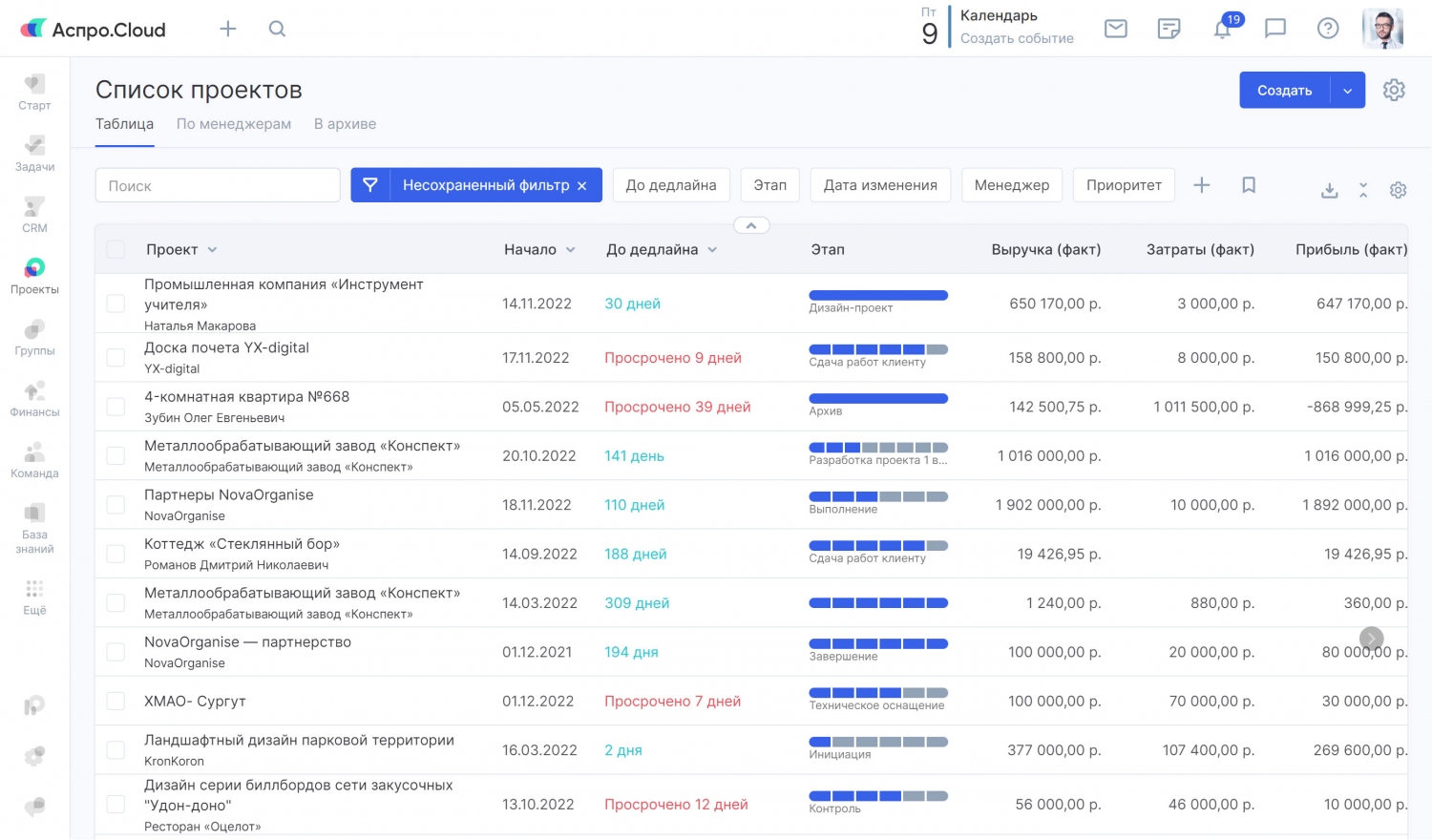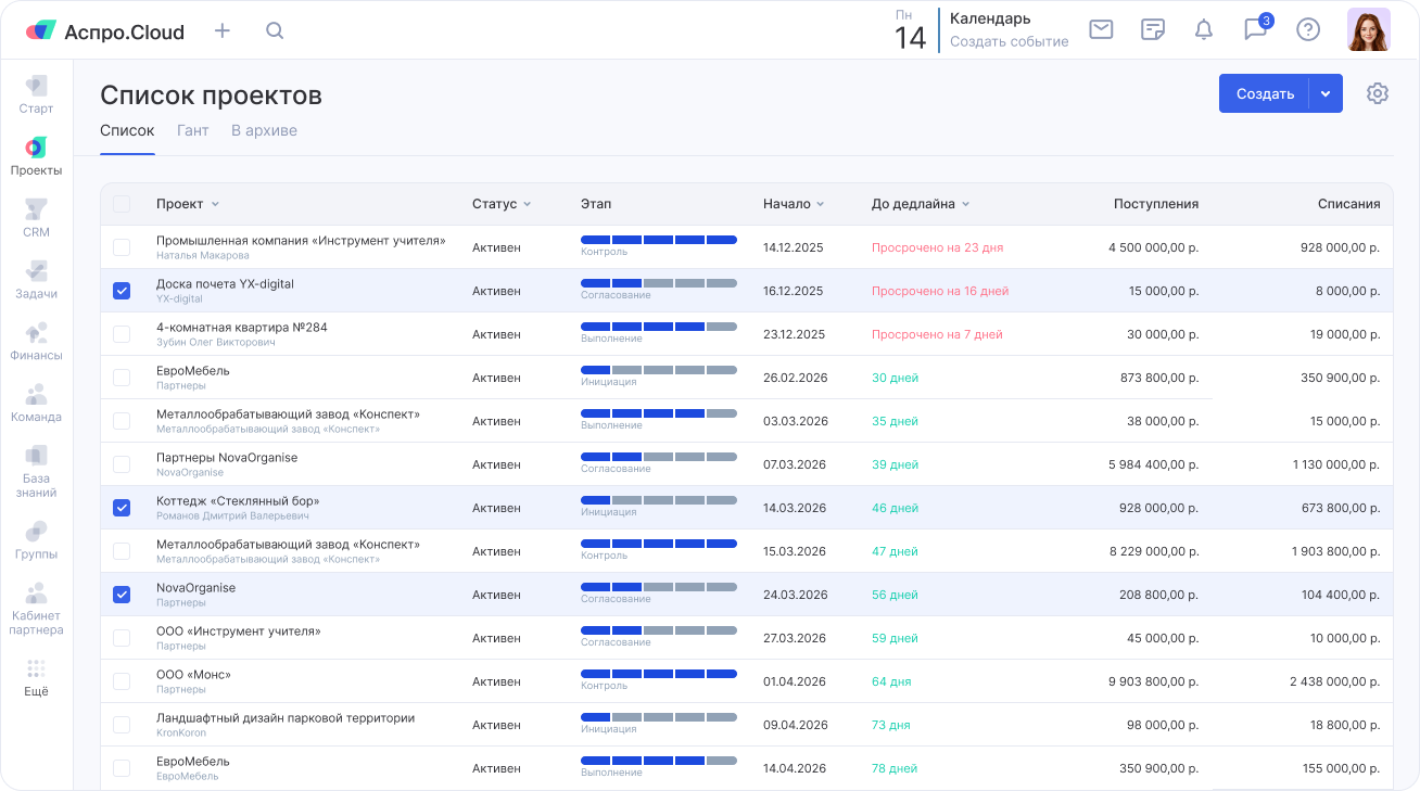 Аспро.Cloud покажет состояние всех проектов на одной странице в виде списка или доски. Прогресс, сроки, бюджет мониторить будет просто.