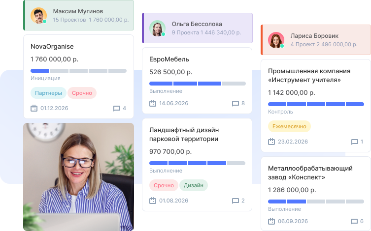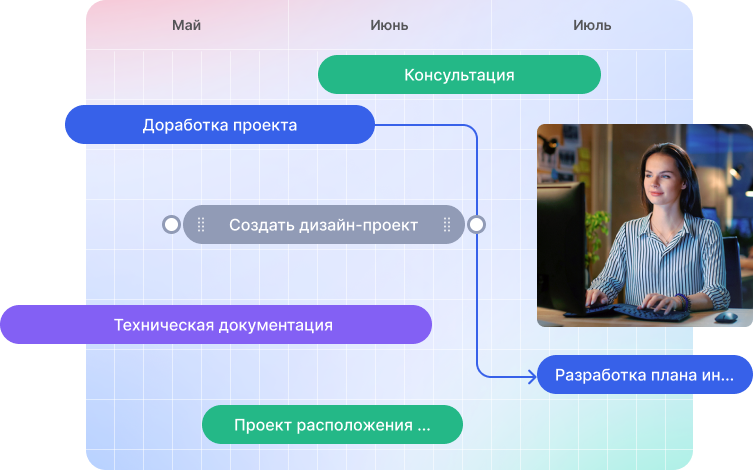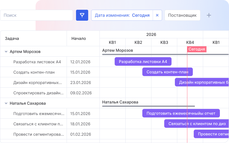 Диаграмма Ганта поможет планировать сложные проекты и связывать задачи по принципу «конец-начало». Отслеживайте прогресс выполнения работ на диаграмме и срывы сроков никогда не будут неожиданностью для команды!