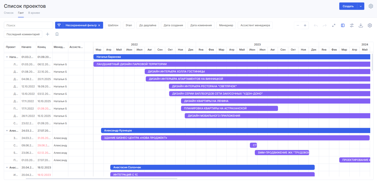 Диаграмма Ганта поможет планировать сложные проекты и связывать задачи по принципу «конец-начало». Отслеживайте прогресс выполнения работ на диаграмме и слово «дедлайн» никогда не будет неожиданностью для команды!
