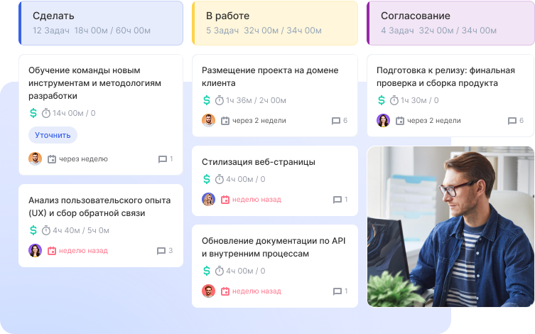 Контролировать прогресс выполнения задач по проекту – легко. На доске видно всё: какие задачи в процессе, какие ожидают контроля, а также сроки, приоритет, плановое и фактическое время, постановщик и ответственный. Благодаря красным индикаторам вы сразу увидите просроченные задачи.