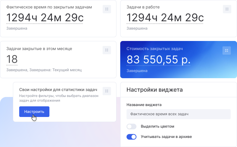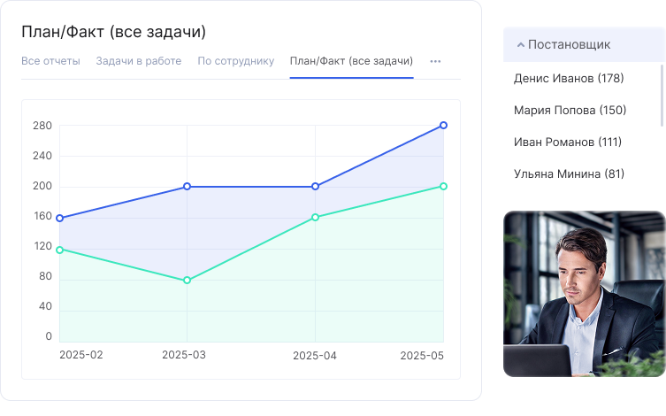 Нет, в Аспро.Cloud есть только преднастроенные отчеты по задачам в СРМ. Зато настраивать под себя можно виджеты на рабочем столе. Вы сами выбираете, что считать в отчете, по какому сотруднику, периоду, приоритету и любым другим критериям.