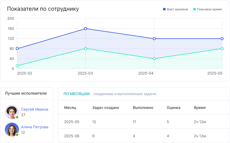 Аспро.Cloud также собирает статистику поручений в работе. Это удобно для отслеживания прогресса задач. Еще один полезный показатель — время выполнения задач и работы по дням.