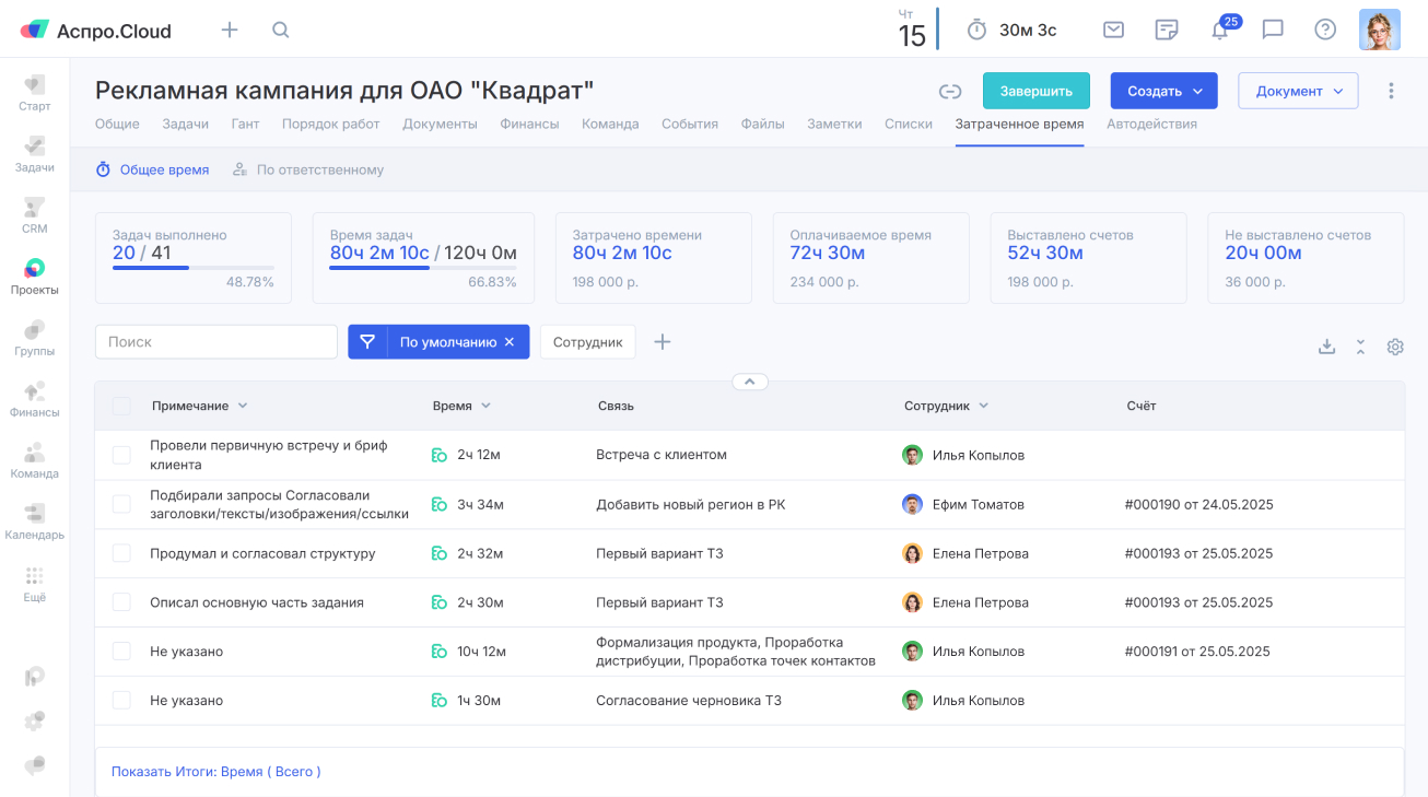 Да. В Аспро.Cloud можно выбрать задачи команды, закрытые за нужный период, и система сама сформирует счет на оплату, учитывая ставку сотрудника и длительность работы. Это особенно удобно, если отработанное время команды влияет на финальную цену для клиента.